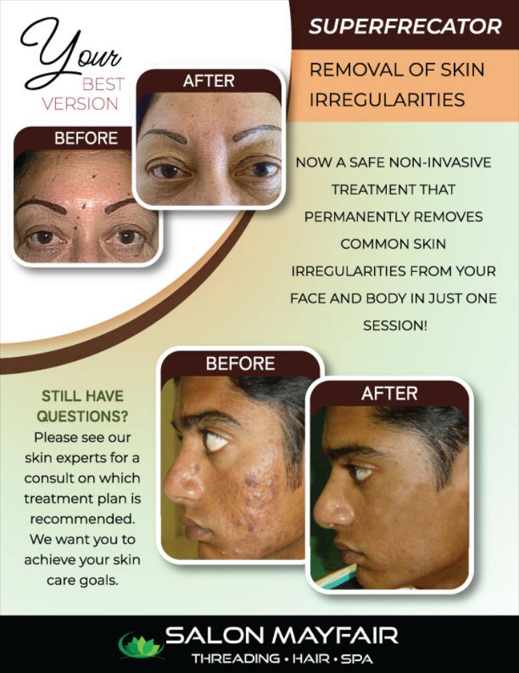 At Salon Mayfair, we’re proud to offer the advanced Superfrecator, a cutting-edge device designed to safely and effectively remove skin imperfections. Whether you’re looking to eliminate sun spots, age spots, or rejuvenate your skin to reduce fine lines and wrinkles, our expert team is here to help you achieve radiant, youthful skin.